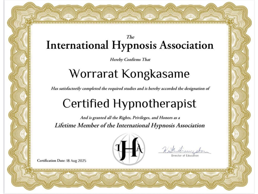 สมาคมสะกดจิตนานาชาติ (International Hypnosis Association)ได้รับการรับรองเป็น ผู้เชี่ยวชาญด้านการสะกดจิตบำบัด (Certified Hypnotherapist)